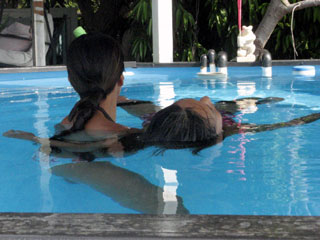 水温は人肌に温められ、身体の抵抗を避ける為に小さな「浮き」も着けますので泳げない人でも安心です。